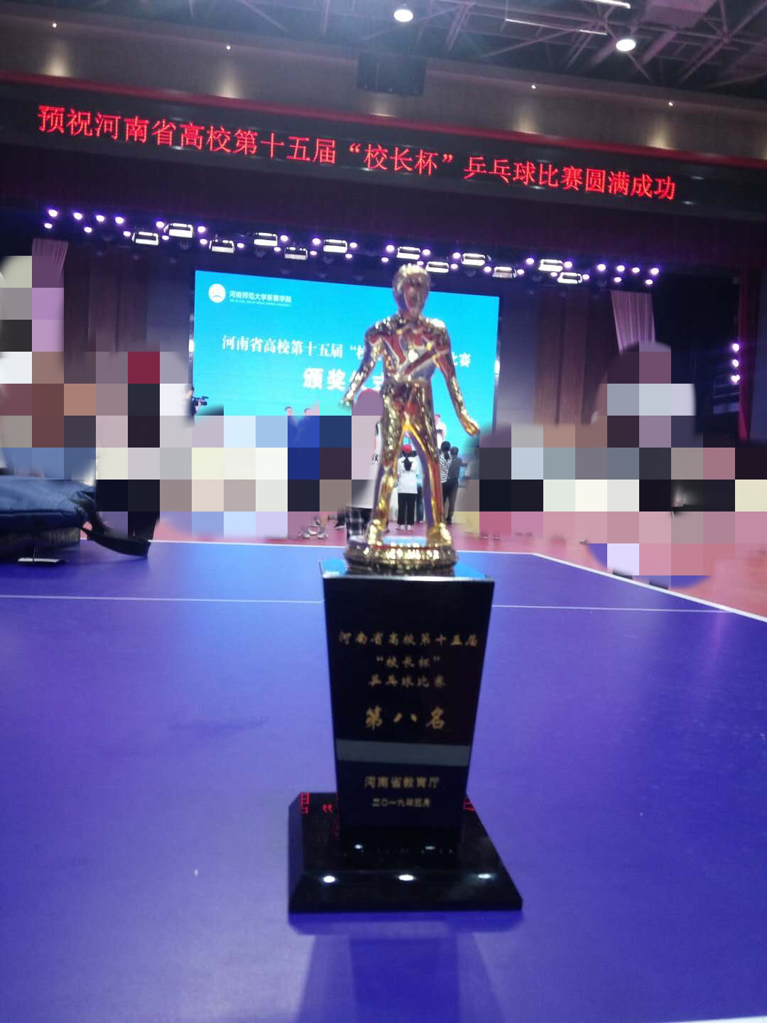 河南省高校第十五届“校长杯”乒乓球比赛于2019年5月11日—2019年5月12日在河南师范大学新联学院成功举办。全省41所高校近200名校领导运动员参加了此次比赛。我校代表队由赵学通书记、李贵敏副书记、戚新波副校长、张国臣副校长、樊羁光副书记组成,由校体育运动委员会主任刘莉莉副校长担任领队。本次比赛赛程紧张,比赛密度较大,对运动员的体力及心理素质都带来了极大的考验,我校代表队运动员顶住压力,克服困难,不畏强手,奋勇拼搏,经过八轮比赛,层层角逐,我校代表队最终取得了第八名的好成绩。