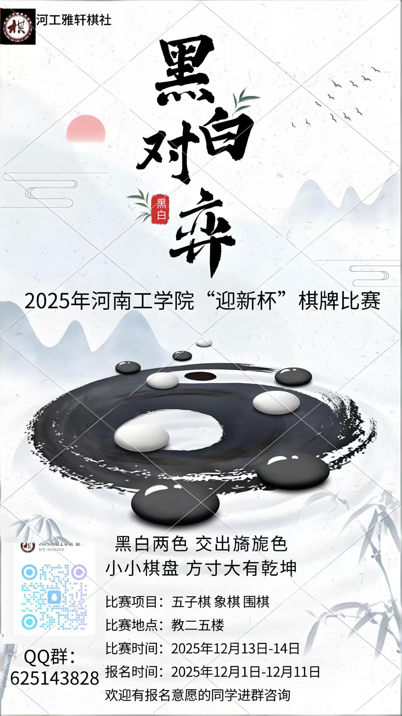 为丰富校园文化生活,增进我校棋类爱好者间的交流与互动,根据学校2025年河南工学院学生体育竞赛活动安排,定于2025年12月13日—12月14日举办2025年河南工学院“迎新杯”棋牌比赛,本次比赛设中国象棋、五子棋、围棋三个个人赛项目,报名通道现已开启,时间为12月5日至11日,有意参赛的同学请务必加入QQ群625143828进行报名,比赛规程见附件,望同学们积极踊跃报名,在赛场展现良好竞技风貌。