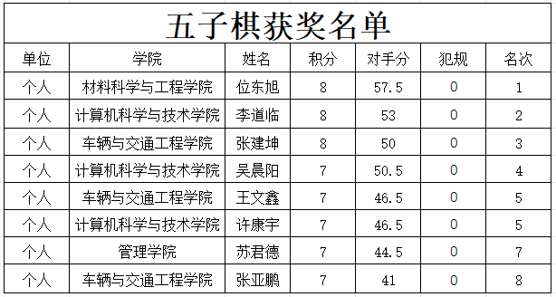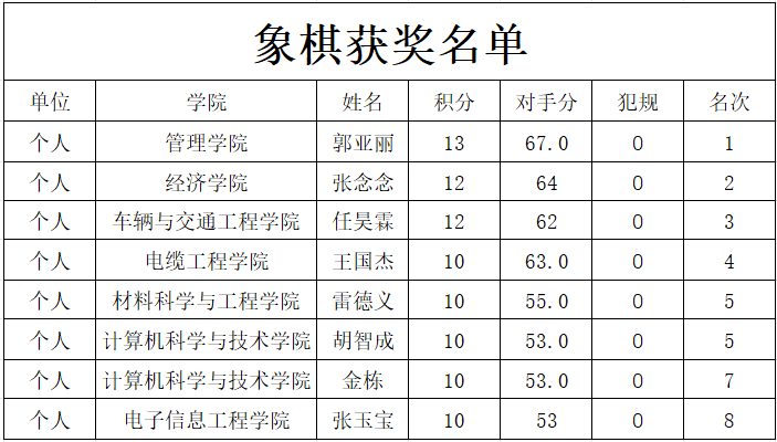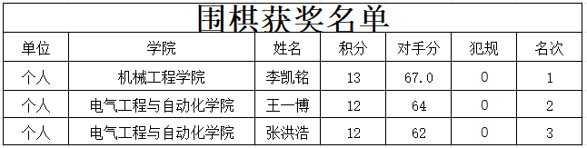 本次比赛共有近300名同学报名参赛,最终在围棋项目中,机械工程学院的李凯铭同学表现更为出色,他的每一步棋都充满了深思熟虑,以出色的稳定性和果断决策夺得了桂冠。而五子棋项目的竞争更加激烈,材料科学与工程学院的位东旭同学以其精湛的技艺和灵活的战术战胜了众多对手,成功捧得冠军奖杯。在中国象棋比赛中,经济学院的郭亚丽同学展现出独特的棋艺,她的每一步棋都充满了智慧和战略,最终赢得了比赛的最高荣誉。
