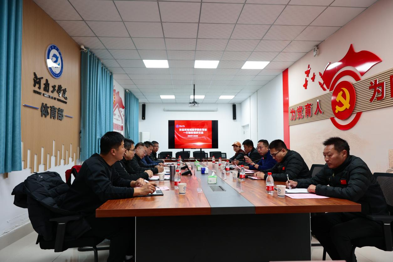 靳守国致欢迎辞,希望通过本次调研交流,增进部门间沟通交流,加强双方党建、教学等方面的深度合作。彭昆介绍了体育部的基本情况、课程建设、体质健康测试、校内外体育竞赛和下一步工作方向。