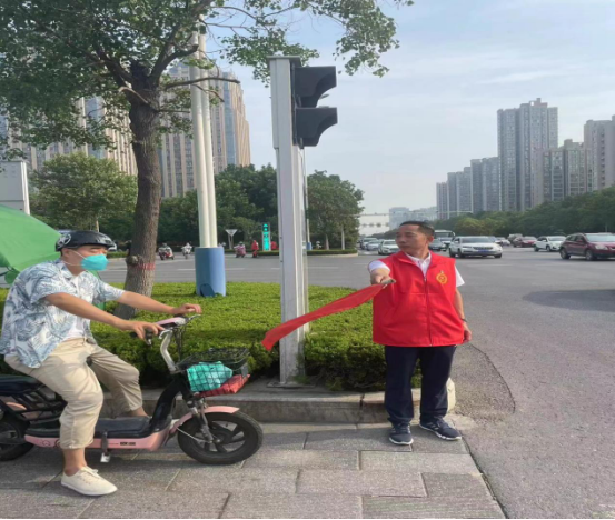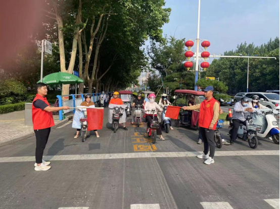 大家身穿红马甲,手持引导旗,引导过往行人和车辆遵守交通法规,文明行路、文明行车,对不文明交通行为进行劝导,提醒注意安全。遇到老人、儿童过斑马线时,大家也立即上前帮扶。