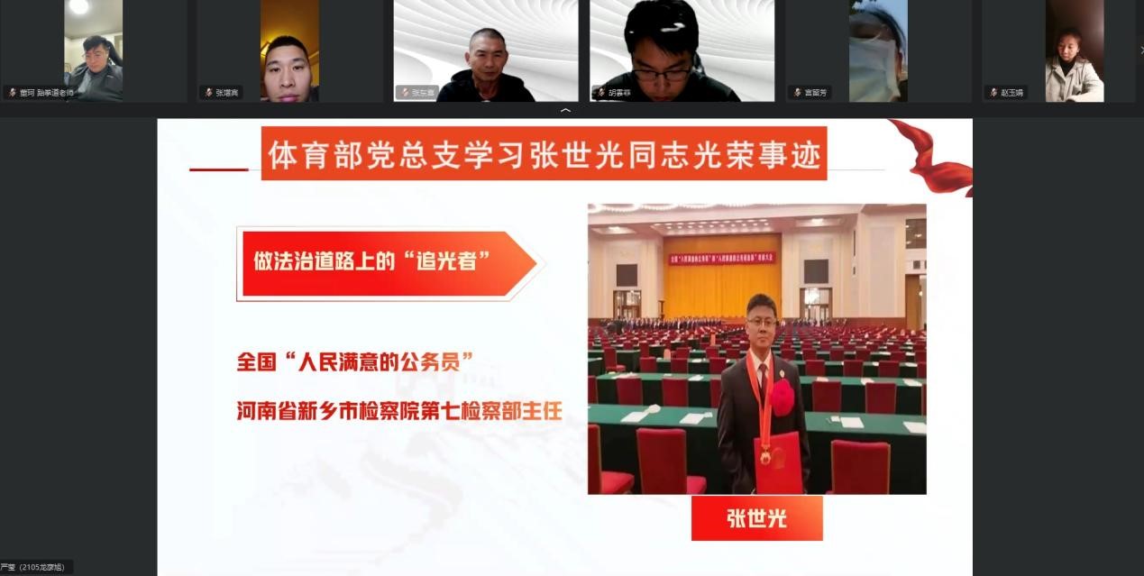 为贯彻落实《中共新乡市委关于向张世光同志学习的决定》精神,体育部于11月10日通过钉钉平台召开线上学习活动,将学习张世光同志的先进事迹与学习贯彻党的二十大精神结合起来。全体教师参加了学习,活动由党总支书记靳守国主持。