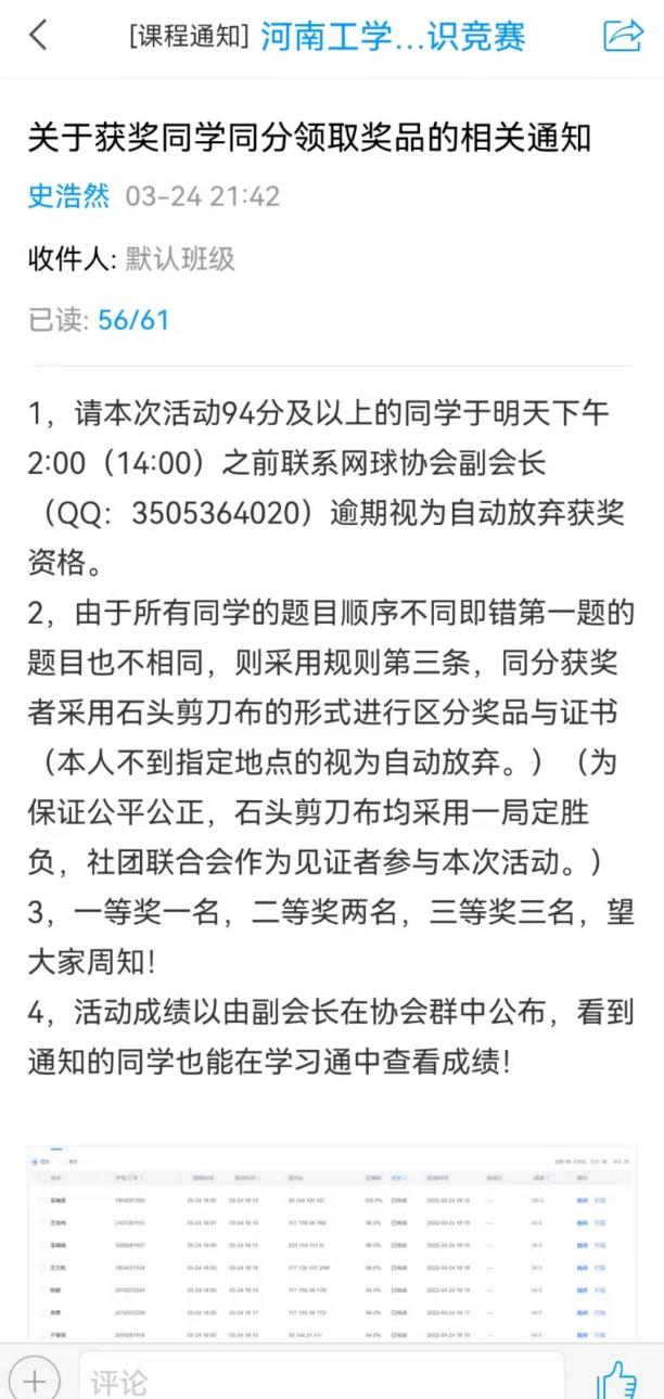 在此活动准备期间我们将活动策划书上报主席团和指导老师批准开展此次活动,并对本次活动展开宣传。宣传方式主要通过网球协会官方QQ以及QQ群进行宣传。本次活动报名方式为通过学习通扫码进入“河工网球知识竞赛班级群”进行报名。在比赛开始前期,指导老师在线讲解答题要求、得分细则、评分标准等内容,通过学习通线上打分,确保活动公平公正公开的原则。本次活动共有60人参加,其中有14人取得九十分及九十分以上的好成绩。