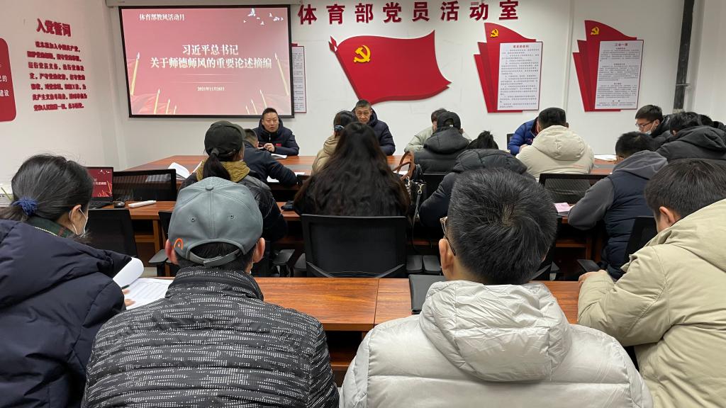 会上,张松青书记首先传达了《教育部关于建立健全高校师德建设长效机制的意见》,随后带领全体教职工认真研读习近平总书记关于师德师风的重要论述,强调体育部要把教师思想政治和师德师风建设摆在体育部工作的首要位置,要求体育部全体教师要围绕立德树人、以德育人的根本任务,以高标准严格要求自己,做到以德立身、以德施教、以德育人,争做"四有、三者"好老师。