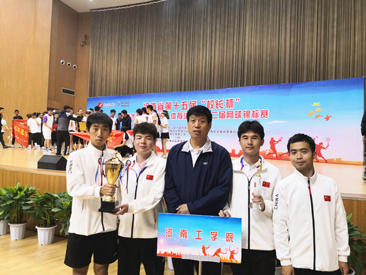 5月10-16日,河南省高校第十五届“校长杯”网球比赛暨大学生“华光”体育活动第十二届网球锦标赛在黄河科技学院举行,全省48所高校共385名运动员和32所高校的领导共87名运动员报名参赛。经过为期一周紧张激烈的角逐,校长陈丙义荣获河南省第十五届“校长杯”乙组季军、我校荣获“校长杯”团体第7名的优异成绩,机械工程学院刘金阳和材料科学与工程学院叶枫荣获河南省大学生第十二届网球锦标赛本科甲组男子双打冠军的优异成绩。