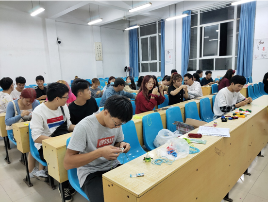 活动开始,先为同学们播放几种球花的编制方法视频,随后同学们领取球托与编织绳,羽毛球协会成员为同学们进行编制指导并在同学们进行自由编制时,提供必要的帮助。活动接近尾声,羽毛球协会成员为有兴趣的同学提供更多种类的球花编制技巧教学,并提供必要的帮助。