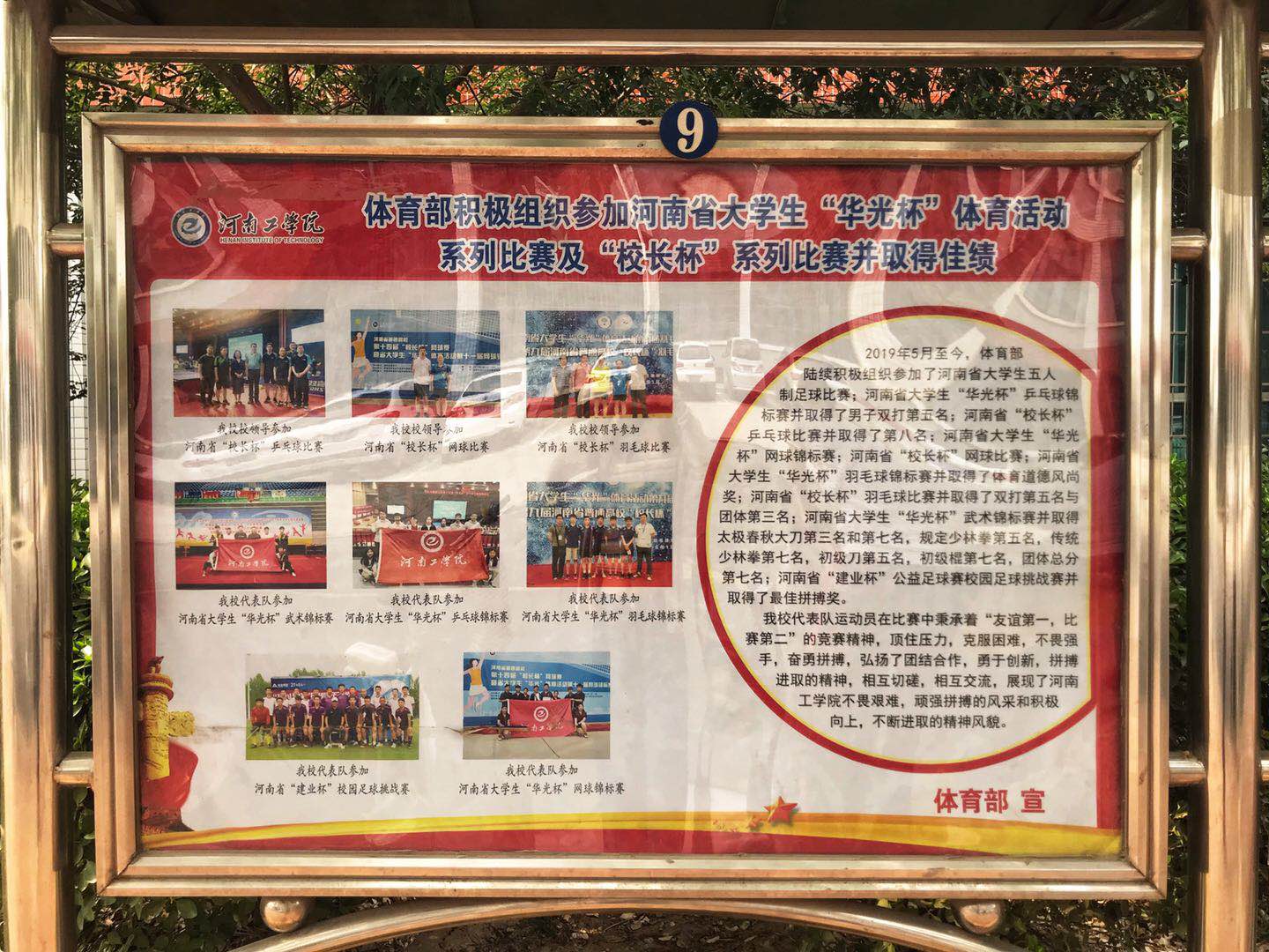 2019年5月至今,体育部陆续积极组织参加了河南省大学生五人制足球比赛;河南省大学生“华光杯”乒乓球锦标赛并取得了男子双打第五名;河南省“校长杯”乒乓球比赛并取得了第八名;河南省大学生“华光杯”网球锦标赛;河南省“校长杯”网球比赛;河南省大学生“华光杯”羽毛球锦标赛并取得了体育道德风尚奖;河南省“校长杯”羽毛球比赛并取得了双打第五名与团体第三名;河南省大学生“华光杯”武术锦标赛并取得太极春秋大刀第三名和第七名,规定少林拳第五名,传统少林拳第七名,初级刀第五名,初级棍第七名,团体总分第七名;河南省“建业杯”公益足球赛校园足球挑战赛并取得了最佳拼搏奖。