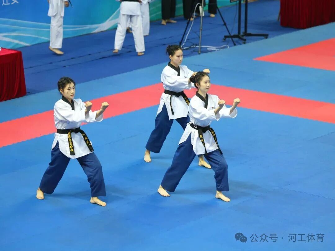 赛场上,我校学子尽显风采。管理学院朱超英、艺术学院李凯旋、电气学院赵珮雯组成的女子团体队,面对连续作战的体力考验,以精准动作与默契配合,成功摘得女子甲组团体进阶品势冠军和女子甲组团体高阶品势季军。