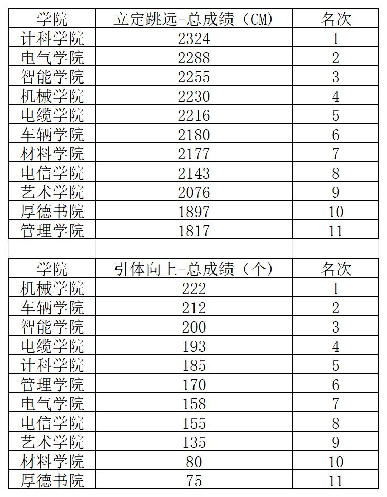 经过近3个小时的激烈角逐,计科学院、电气学院、智能学院分别获立定跳远冠亚季军;机械学院、车辆学院、智能学院分别获得引体向上团体赛冠亚季军。