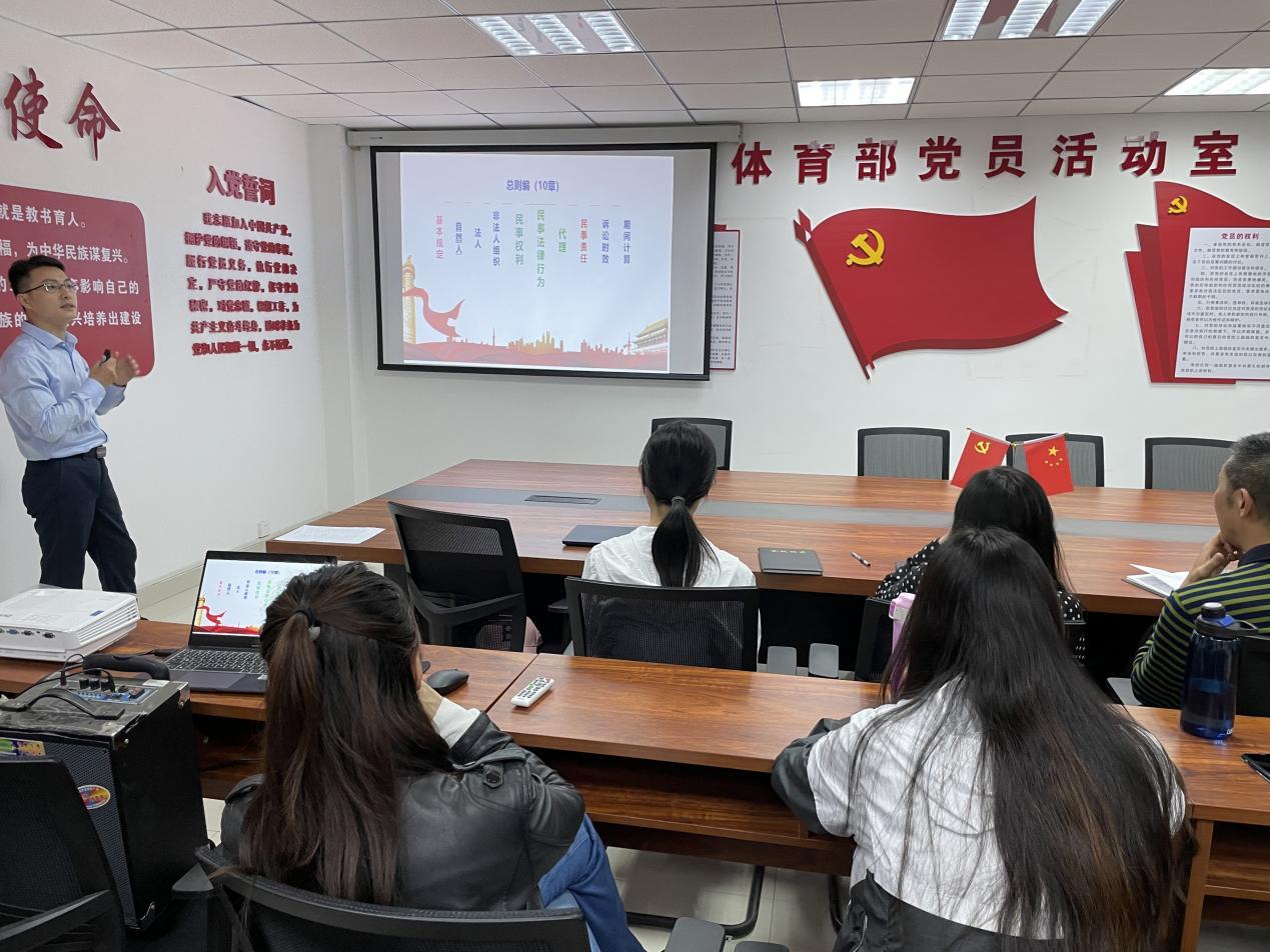为深入学习贯彻落实习近平总书记在学动员大会上的重要讲话精神,加强党的思想建设,结合河南工学院党史学习教育目标和体育部的实际工作,坚定党员干部的理想信念,强化人民教师使命担当,紧紧围绕“学党史、悟思想、办实事,开新局”,牢记“为党育人,为国育才”的初心使命,不断提高个人思想政治素养和道德修养,结合体育部党总支开展“走出去,请进来”的党建工作计划与党史学习教育“我为师生办实事”,邀请中原法汇律师事务所于5月19日到体育部进行民法典法律知识讲座。