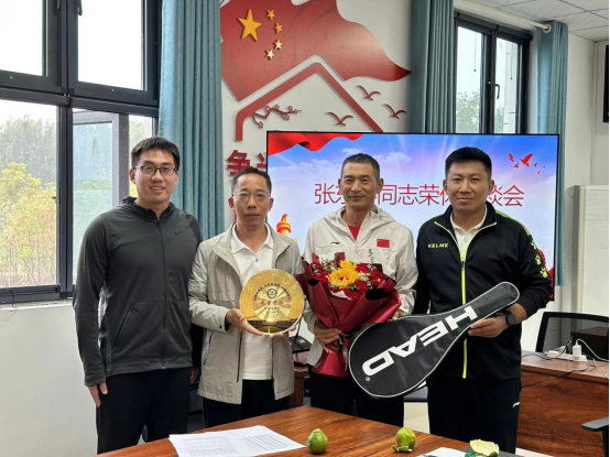 最后,体育部主任彭昆为张东喜同志送上鲜花和纪念品,并合影留念。