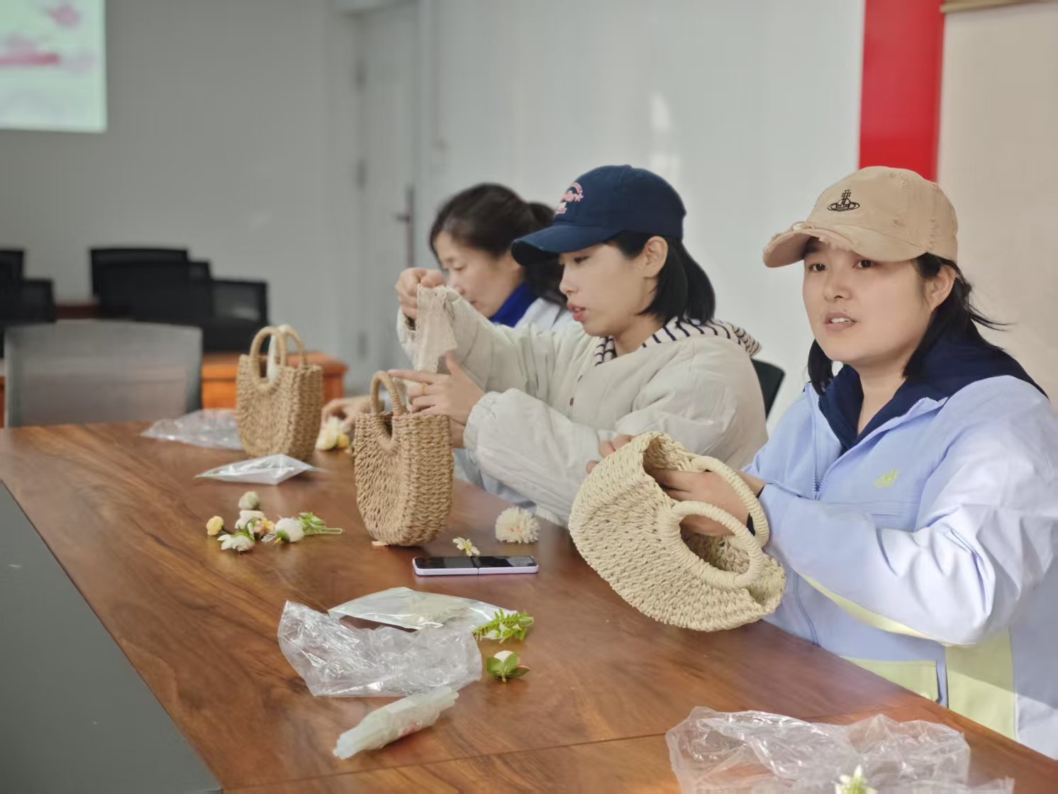 经过大家的努力,一个个精美的手编包在老师们手中诞生。这些手编包展现出老师们的创意与审美。拿着自己的作品,老师们纷纷拍照留念,脸上洋溢着自豪与满足的笑容。