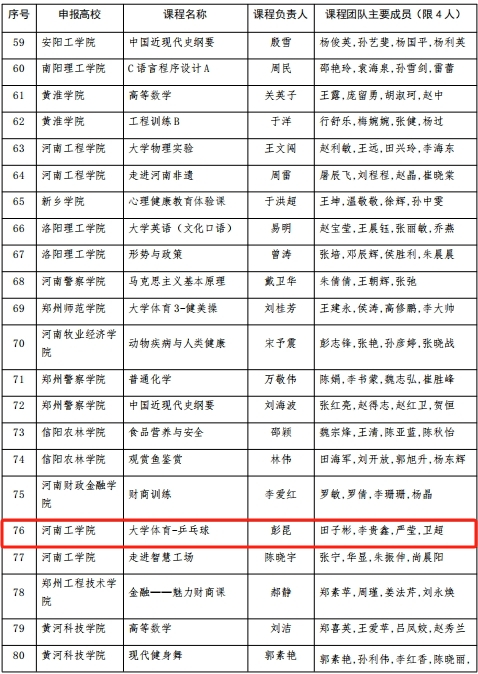 近日,河南省教育厅发布《关于第二批河南省通识教育示范课程认定名单的公示》,我部彭昆老师主持申报的《大学体育-乒乓球》通识教育课程,获第二批河南省通识教育示范课程认定。