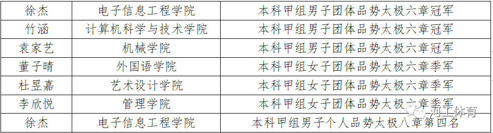 我校共派出6名队员组成的代表队参加本次比赛。经过7天的奋力拼搏,我校跆拳道代表队取得了本科甲组男子团体品势冠军、本科甲组女子团体品势季军、本科甲组男子个人品势第四名的优异成绩。本次比赛成绩的的取得是我校建校以来体育竞赛在国赛的首次突破和最高奖项。在比赛过程中我校代表队充分发挥出自己的平时训练所得和自身的潜力,在比赛中展现出了过硬的技术水平和顽强的拼搏精神,为学校赢得了荣誉。