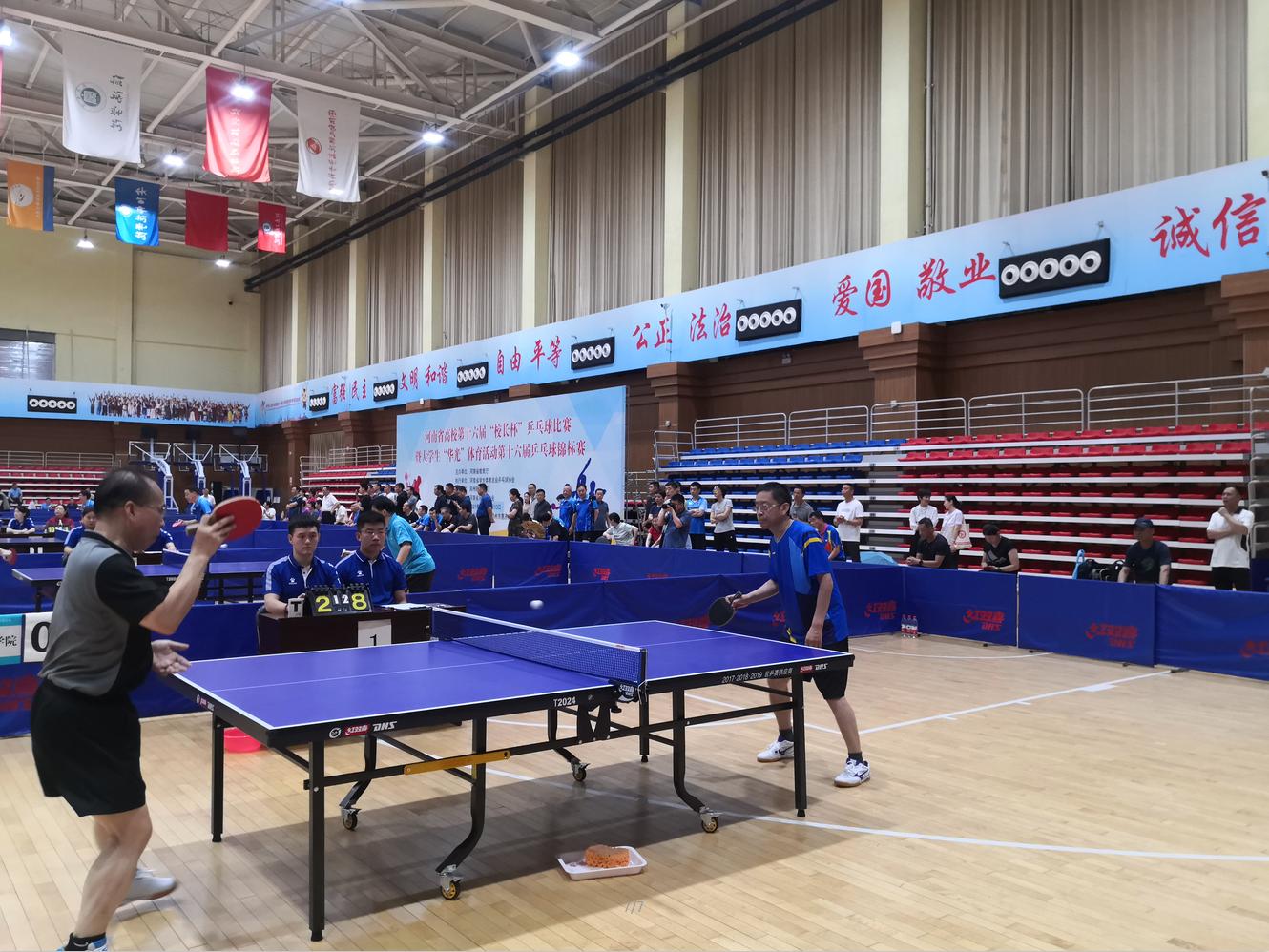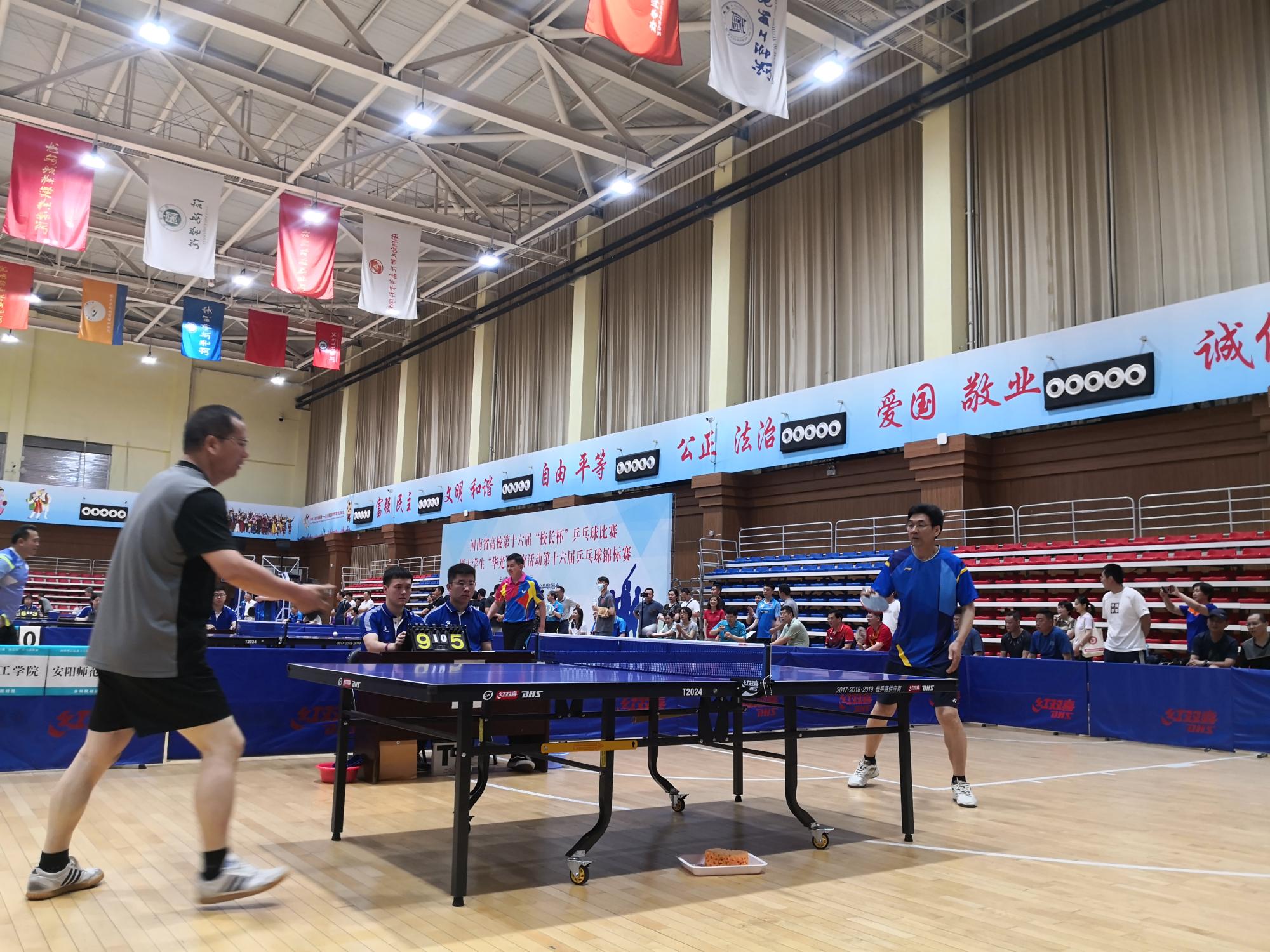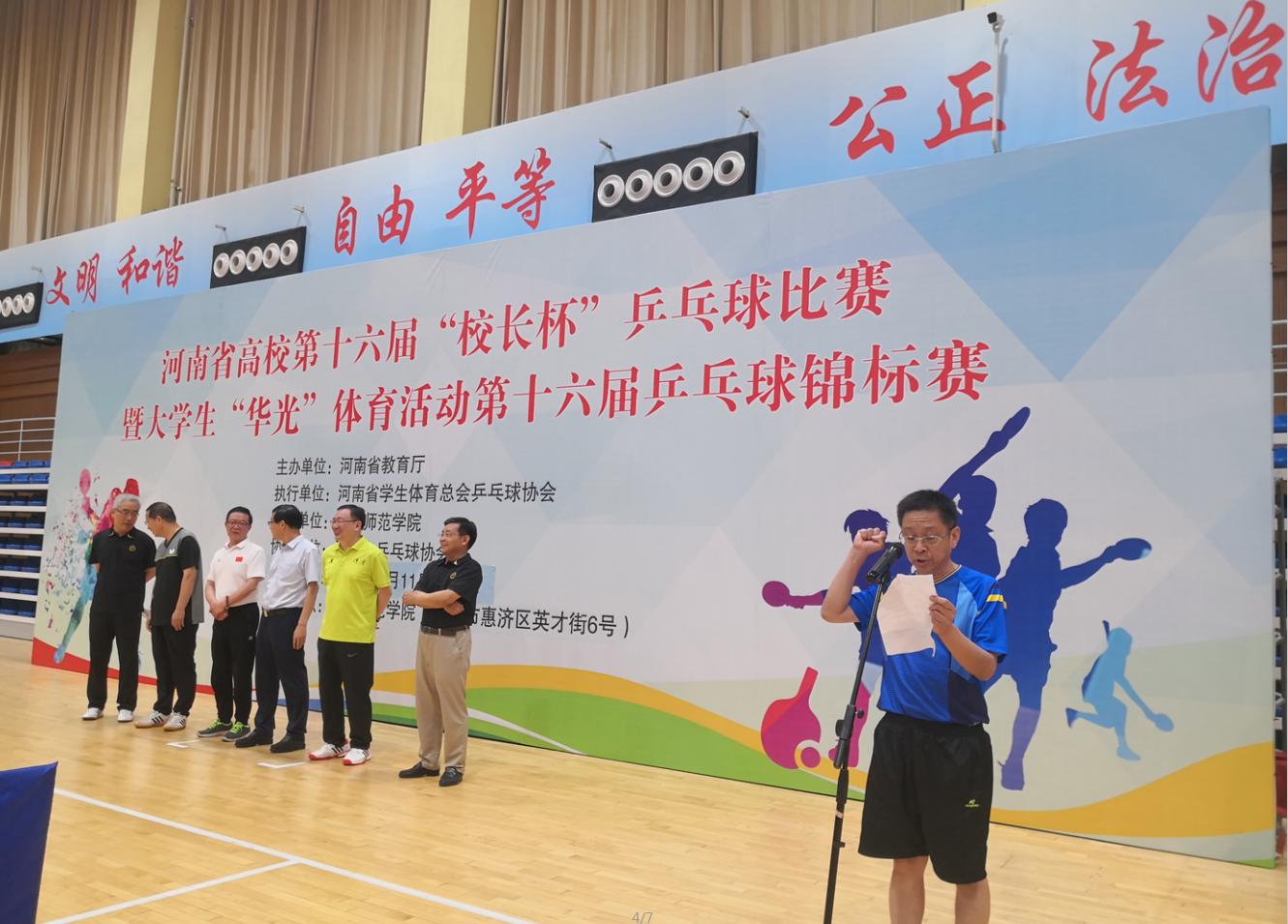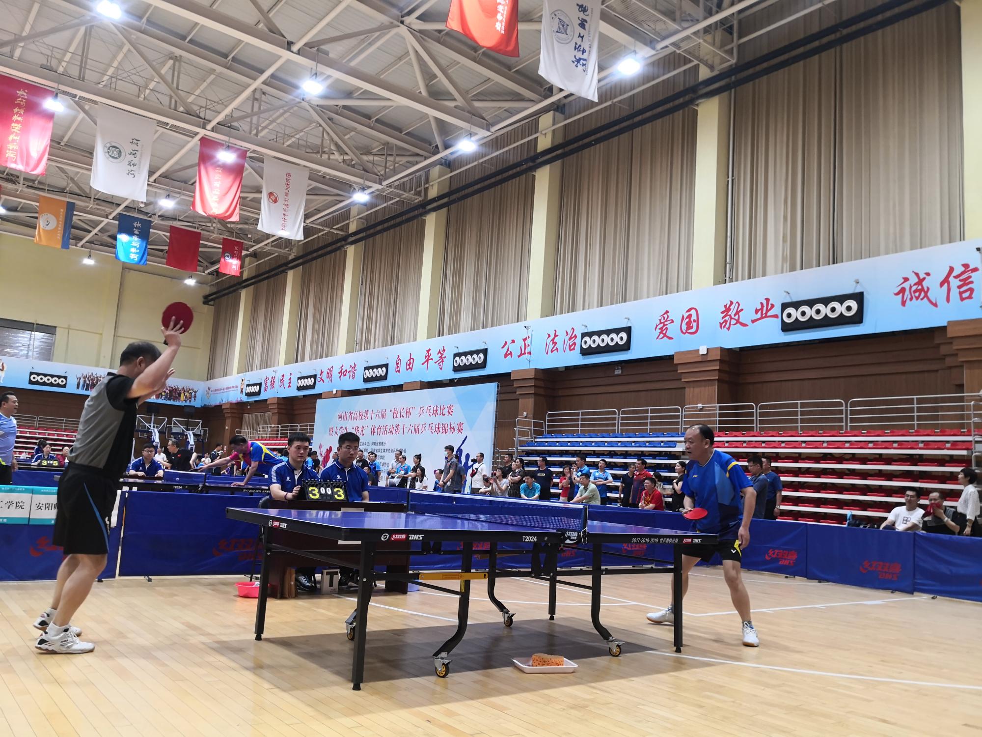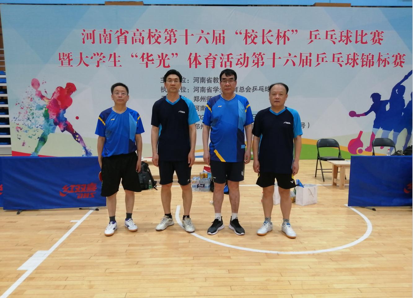 河南省高校第十六届“校长杯”乒乓球比赛于2021年6月11日—6月13日在郑州师范学院成功举办。全省50所高校近200名校领导运动员参加了此次比赛。我校代表队由赵学通书记、李贵敏副书记、戚新波副校长、张国臣副校长、樊羁光纪委书记组成,校体育运动委员会主任刘莉莉副校长担任领队。开幕式上,我校张国臣副校长作为参加全国高校“校长杯”运动员,代表本次比赛全体运动员进行宣誓。本次比赛赛程紧张,比赛强度大,对运动员的体力及心理素质都带来了极大的考验。我校代表队顶住压力,克服困难,不畏强手,奋勇拼搏。在十六进八的比赛中,3:2逆转战胜河南中医药大学挺进八强,在八进四的比赛中,苦战五场,最终以2:3憾负安阳师范学院(冠军),在五至八名排位赛中,连克强劲对手,我校最终取得了第五名的好成绩。