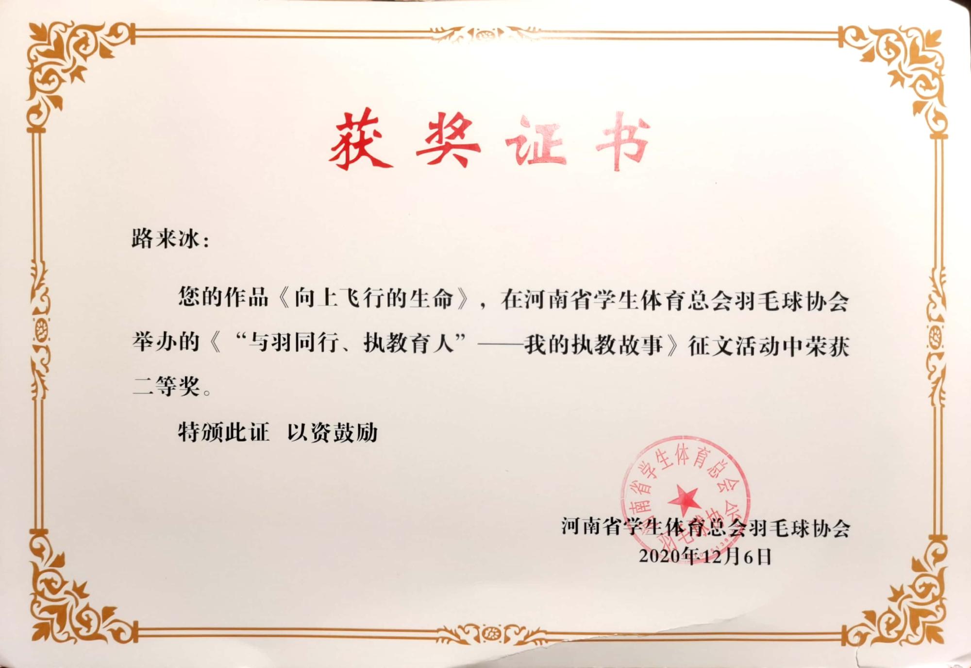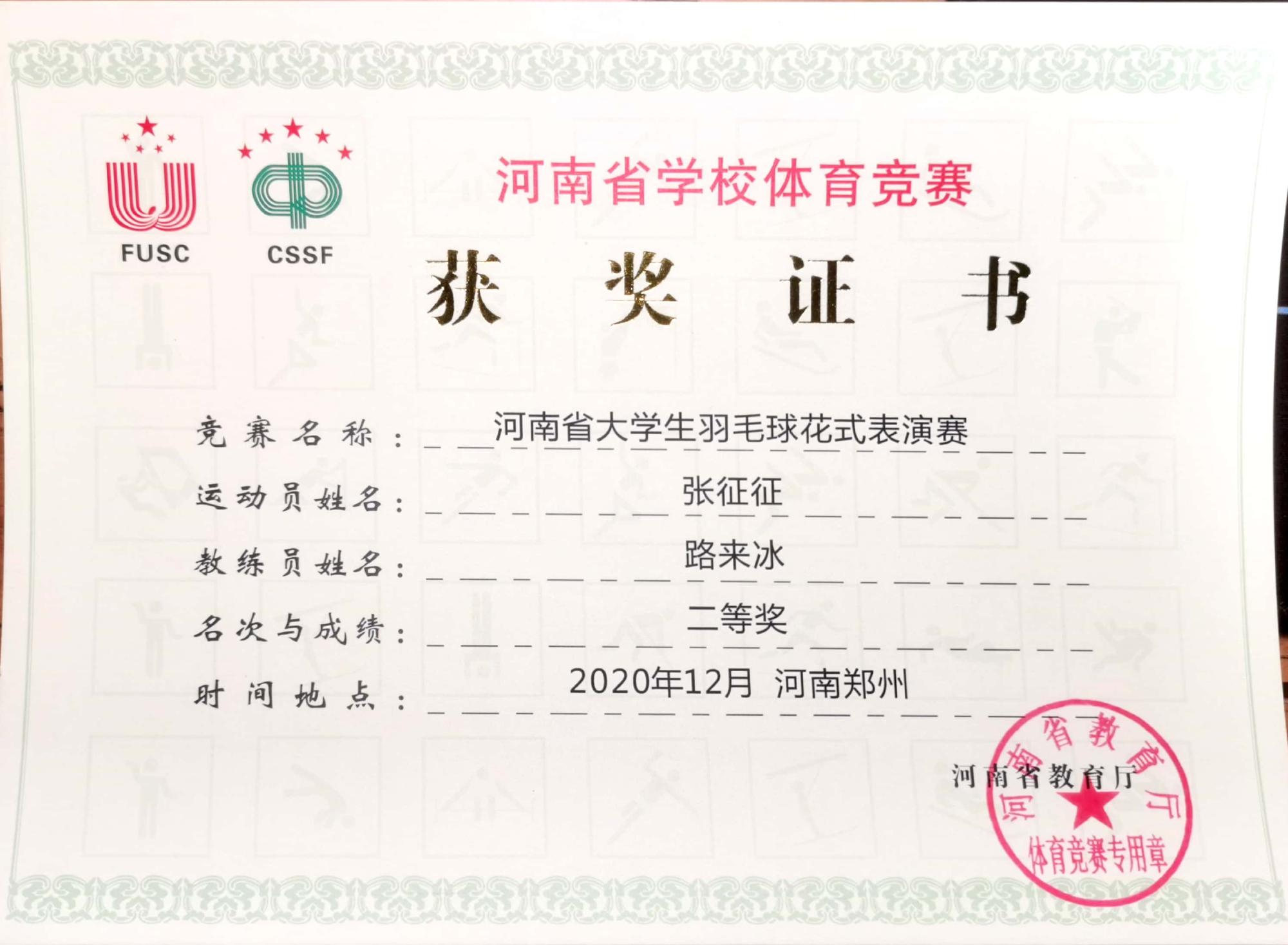 经过充分准备与精心拍摄剪辑,软件182班张征征获得河南省大学生羽毛球花式表演赛二等奖,化工192班李璟睿、物联网工程202班徐苏斌、软件192班魏宁、环境设计181班李宇航获得三等奖。同时指导教师路来冰获得《“与你同行,执教育人”-我的执教故事》征文活动二等奖。此次活动填补了由于疫情而取消的线下竞赛的空白,调动了学生训练的热情与积极性,也为来年的羽毛球“华光”体育活动进行了预热。