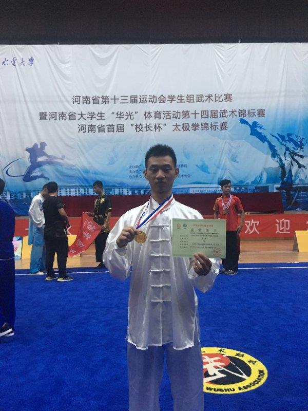 2018年7月10日至14日,由河南省教育厅、河南省体育局主办,河南省学生体育总会武术协会协办,华北水利水电大学承办的河南省大学生“华光”体育活动第十四届武术锦标赛在华北水利水电大学隆重举行。来自全省59所高校代表队的719名运动员参加了本次比赛。我校派出了以基础部主任陈超任领队的代表团参加了本届比赛。经过五天的激烈角逐,来自机械工程系的王文斌获得了本科男子甲组陈式太极长器械第一名的优异成绩。
