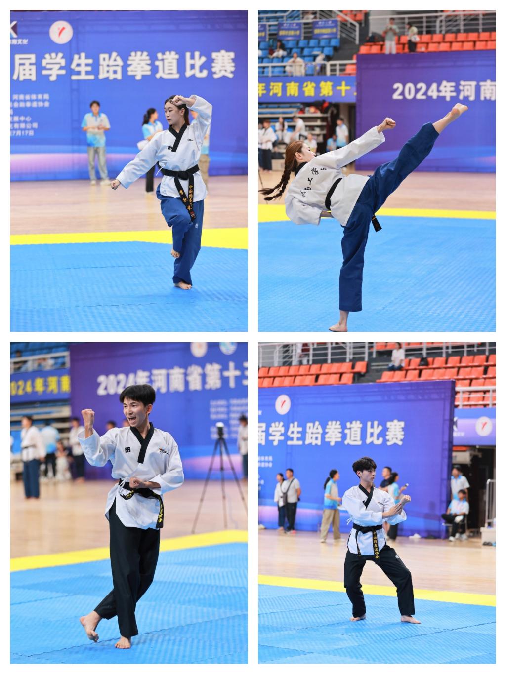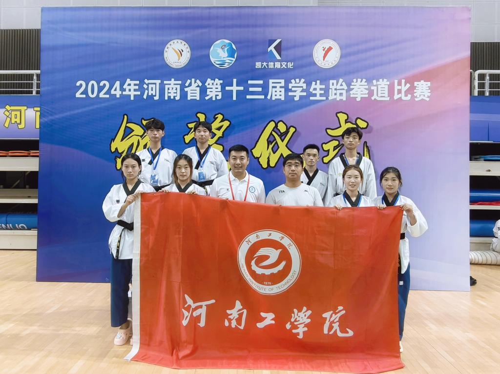 2024年7月13日至17日,河南省第十三届学生跆拳道比赛在鹤壁千鹤之舞体育馆盛大开幕。本次赛事汇聚全省60多所高校,共计700余名运动员同场竞技。我校派出3名教练员、8名队员组成的代表队参加本次比赛。经过五天紧张激烈的比赛,河南工学院跆拳道代表队荣获3枚金牌、1枚银牌和2枚铜牌的佳绩,董珂老师获得了“优秀教练员”的荣誉称号。